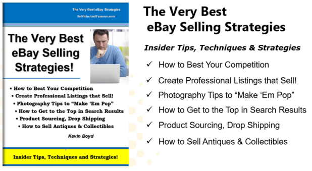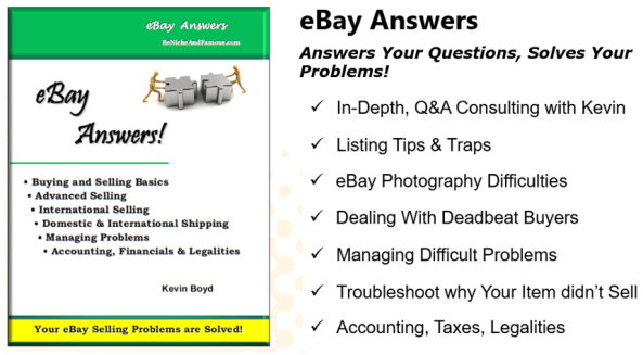 This eBook is written as in-depth Q&A with Kevin. It will answer your eBay selling questions and solve your problems including listing creation, photography, packing and shipping, international selling, dealing with deadbeat bidders, managing difficult problems, where to get your products, and what to do if an item does not sell. Also includes latest tips and proven strategies for getting the most bids and the highest price!